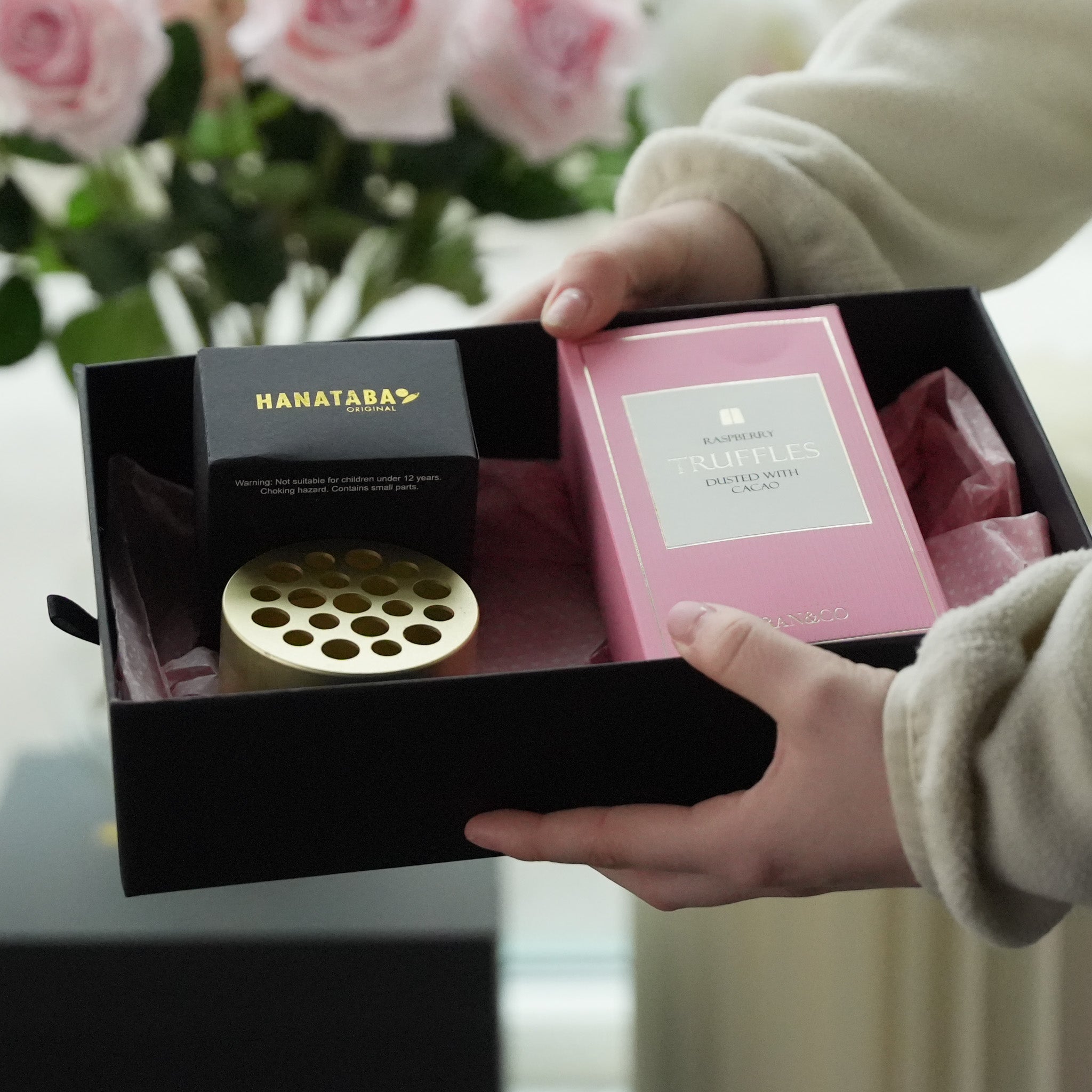 Pakken indeholder Hanatabas mest solgte produkt nogensinde i farven Champagne Gold – et elegant blomsterredskab, der gør det muligt for hende at lave sine egne buketter derhjemme. En kreativ og romantisk oplevelse, som gør hver buket endnu smukkere.